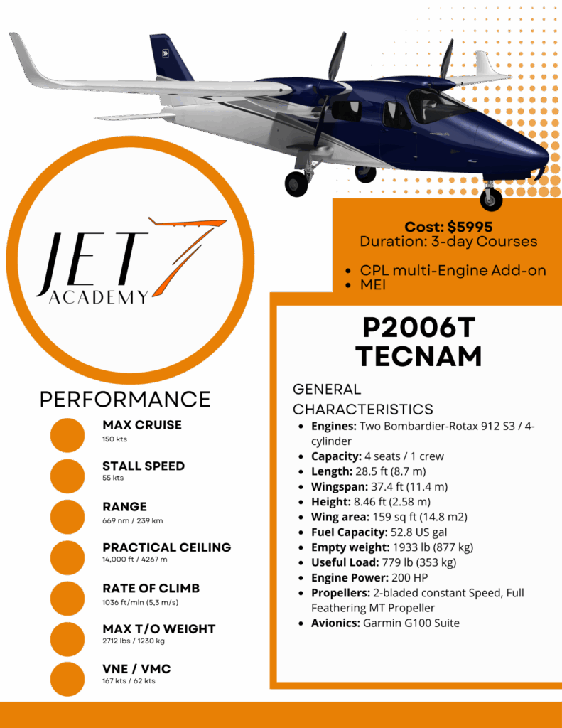 Step into the world of multi-engine flying with confidence. At Jet 7 Academy, we offer accelerated and comprehensive multi-engine training using the Tecnam P2006T—a modern, cost-effective twin-engine aircraft designed with training in mind.